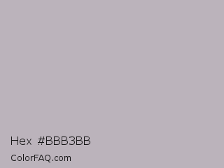Hex #bbb3bb Color is a light magenta color and the nearest color is Pink Swan #beb5b7. Hex code #bbb3bb and RGB value is rgb(187,179,187). In RGB color space, this color is composed of 73% red, 70% green, 73% blue, In CMYK color space, this color is composed of 0% cyan, 4% magenta, 0% yellow , 27% black , In HSL color space, this color has a hue angle of 300° , 6% saturation and 72% lightness.
