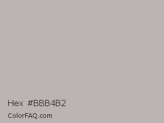 Hex #bbb4b2 Color is a light red color and the nearest color is Nobel #b7b1b1. Hex code #bbb4b2 and RGB value is rgb(187,180,178). In RGB color space, this color is composed of 73% red, 71% green, 70% blue, In CMYK color space, this color is composed of 0% cyan, 4% magenta, 5% yellow , 27% black , In HSL color space, this color has a hue angle of 13° , 6% saturation and 72% lightness.