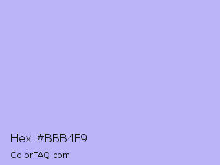Hex #bbb4f9 Color is a very light indigo color and the nearest color is Melrose #c7c1ff. Hex code #bbb4f9 and RGB value is rgb(187,180,249). In RGB color space, this color is composed of 73% red, 71% green, 98% blue, In CMYK color space, this color is composed of 25% cyan, 28% magenta, 0% yellow , 2% black , In HSL color space, this color has a hue angle of 246° , 85% saturation and 84% lightness.
