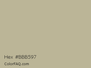 Hex #bbb597 Color is a light yellow color and the nearest color is Heathered Gray #b6b095. Hex code #bbb597 and RGB value is rgb(187,181,151). In RGB color space, this color is composed of 73% red, 71% green, 59% blue, In CMYK color space, this color is composed of 0% cyan, 3% magenta, 19% yellow , 27% black , In HSL color space, this color has a hue angle of 50° , 21% saturation and 66% lightness.