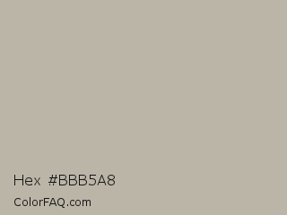 Hex #bbb5a8 Color is a light orange color and the nearest color is Silk #bdb1a8. Hex code #bbb5a8 and RGB value is rgb(187,181,168). In RGB color space, this color is composed of 73% red, 71% green, 66% blue, In CMYK color space, this color is composed of 0% cyan, 3% magenta, 10% yellow , 27% black , In HSL color space, this color has a hue angle of 41° , 12% saturation and 70% lightness.