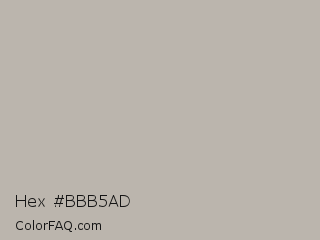 Hex #bbb5ad Color is a light orange color and the nearest color is Tide #bfb8b0. Hex code #bbb5ad and RGB value is rgb(187,181,173). In RGB color space, this color is composed of 73% red, 71% green, 68% blue, In CMYK color space, this color is composed of 0% cyan, 3% magenta, 7% yellow , 27% black , In HSL color space, this color has a hue angle of 34° , 9% saturation and 71% lightness.