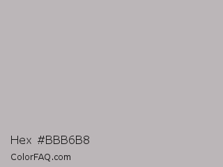 Hex #bbb6b8 Color is a light rose color and the nearest color is Pink Swan #beb5b7. Hex code #bbb6b8 and RGB value is rgb(187,182,184). In RGB color space, this color is composed of 73% red, 71% green, 72% blue, In CMYK color space, this color is composed of 0% cyan, 3% magenta, 2% yellow , 27% black , In HSL color space, this color has a hue angle of 336° , 4% saturation and 72% lightness.