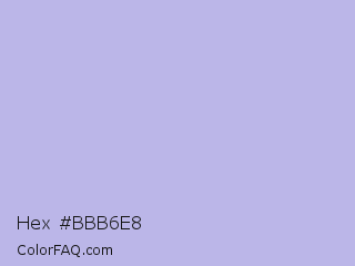 Hex #bbb6e8 Color is a very light indigo color and the nearest color is Lavender Gray #bdbbd7. Hex code #bbb6e8 and RGB value is rgb(187,182,232). In RGB color space, this color is composed of 73% red, 71% green, 91% blue, In CMYK color space, this color is composed of 19% cyan, 22% magenta, 0% yellow , 9% black , In HSL color space, this color has a hue angle of 246° , 52% saturation and 81% lightness.