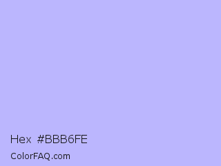 Hex #bbb6fe Color is a very light indigo color and the nearest color is Melrose #c7c1ff. Hex code #bbb6fe and RGB value is rgb(187,182,254). In RGB color space, this color is composed of 73% red, 71% green, 100% blue, In CMYK color space, this color is composed of 26% cyan, 28% magenta, 0% yellow , 0% black , In HSL color space, this color has a hue angle of 244° , 97% saturation and 85% lightness.
