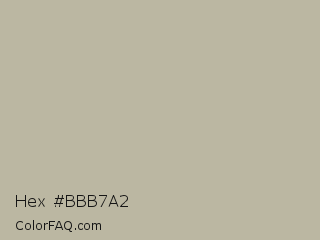 Hex #bbb7a2 Color is a light yellow color and the nearest color is Malta #bdb2a1. Hex code #bbb7a2 and RGB value is rgb(187,183,162). In RGB color space, this color is composed of 73% red, 72% green, 64% blue, In CMYK color space, this color is composed of 0% cyan, 2% magenta, 13% yellow , 27% black , In HSL color space, this color has a hue angle of 50° , 16% saturation and 68% lightness.