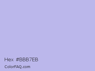 Hex #bbb7eb Color is a very light indigo color and the nearest color is Maximum Blue Purple #acace6. Hex code #bbb7eb and RGB value is rgb(187,183,235). In RGB color space, this color is composed of 73% red, 72% green, 92% blue, In CMYK color space, this color is composed of 20% cyan, 22% magenta, 0% yellow , 8% black , In HSL color space, this color has a hue angle of 245° , 57% saturation and 82% lightness.