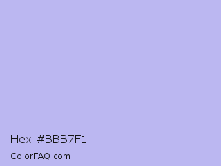 Hex #bbb7f1 Color is a very light indigo color and the nearest color is Perano #a9bef2. Hex code #bbb7f1 and RGB value is rgb(187,183,241). In RGB color space, this color is composed of 73% red, 72% green, 95% blue, In CMYK color space, this color is composed of 22% cyan, 24% magenta, 0% yellow , 5% black , In HSL color space, this color has a hue angle of 244° , 67% saturation and 83% lightness.