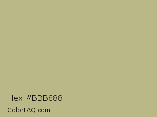 Hex #bbb888 Color is a light yellow color and the nearest color is Sage #bcb88a. Hex code #bbb888 and RGB value is rgb(187,184,136). In RGB color space, this color is composed of 73% red, 72% green, 53% blue, In CMYK color space, this color is composed of 0% cyan, 2% magenta, 27% yellow , 27% black , In HSL color space, this color has a hue angle of 56° , 27% saturation and 63% lightness.