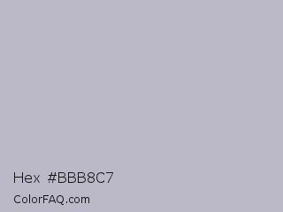 Hex #bbb8c7 Color is a light indigo color and the nearest color is Chatelle #bdb3c7. Hex code #bbb8c7 and RGB value is rgb(187,184,199). In RGB color space, this color is composed of 73% red, 72% green, 78% blue, In CMYK color space, this color is composed of 6% cyan, 8% magenta, 0% yellow , 22% black , In HSL color space, this color has a hue angle of 252° , 12% saturation and 75% lightness.