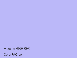 Hex #bbb8f9 Color is a very light indigo color and the nearest color is Melrose #c7c1ff. Hex code #bbb8f9 and RGB value is rgb(187,184,249). In RGB color space, this color is composed of 73% red, 72% green, 98% blue, In CMYK color space, this color is composed of 25% cyan, 26% magenta, 0% yellow , 2% black , In HSL color space, this color has a hue angle of 243° , 84% saturation and 85% lightness.