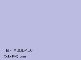 Hex #bbbae0 Color is a light indigo color and the nearest color is Lavender Gray #bdbbd7. Hex code #bbbae0 and RGB value is rgb(187,186,224). In RGB color space, this color is composed of 73% red, 73% green, 88% blue, In CMYK color space, this color is composed of 17% cyan, 17% magenta, 0% yellow , 12% black , In HSL color space, this color has a hue angle of 242° , 38% saturation and 80% lightness.