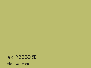 Hex #bbbd6d Color is a normal yellow color and the nearest color is Dark Khaki #bdb76b. Hex code #bbbd6d and RGB value is rgb(187,189,109). In RGB color space, this color is composed of 73% red, 74% green, 43% blue, In CMYK color space, this color is composed of 1% cyan, 0% magenta, 42% yellow , 26% black , In HSL color space, this color has a hue angle of 62° , 38% saturation and 58% lightness.