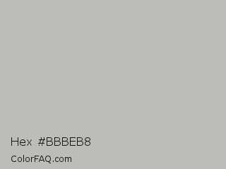 Hex #bbbeb8 Color is a light green color and the nearest color is Gray X11 Gray #bebebe. Hex code #bbbeb8 and RGB value is rgb(187,190,184). In RGB color space, this color is composed of 73% red, 75% green, 72% blue, In CMYK color space, this color is composed of 2% cyan, 0% magenta, 3% yellow , 25% black , In HSL color space, this color has a hue angle of 90° , 4% saturation and 73% lightness.