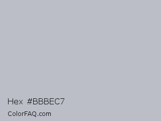 Hex #bbbec7 Color is a light blue color and the nearest color is French Gray #bdbdc6. Hex code #bbbec7 and RGB value is rgb(187,190,199). In RGB color space, this color is composed of 73% red, 75% green, 78% blue, In CMYK color space, this color is composed of 6% cyan, 5% magenta, 0% yellow , 22% black , In HSL color space, this color has a hue angle of 225° , 10% saturation and 76% lightness.