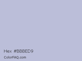 Hex #bbbed9 Color is a light blue color and the nearest color is Blue Haze #bfbed8. Hex code #bbbed9 and RGB value is rgb(187,190,217). In RGB color space, this color is composed of 73% red, 75% green, 85% blue, In CMYK color space, this color is composed of 14% cyan, 12% magenta, 0% yellow , 15% black , In HSL color space, this color has a hue angle of 234° , 28% saturation and 79% lightness.