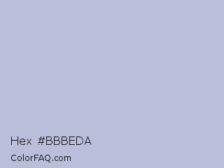Hex #bbbeda Color is a light blue color and the nearest color is Blue Haze #bfbed8. Hex code #bbbeda and RGB value is rgb(187,190,218). In RGB color space, this color is composed of 73% red, 75% green, 85% blue, In CMYK color space, this color is composed of 14% cyan, 13% magenta, 0% yellow , 15% black , In HSL color space, this color has a hue angle of 234° , 30% saturation and 79% lightness.