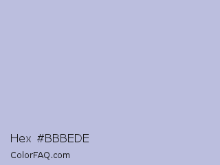 Hex #bbbede Color is a light blue color and the nearest color is Blue Haze #bfbed8. Hex code #bbbede and RGB value is rgb(187,190,222). In RGB color space, this color is composed of 73% red, 75% green, 87% blue, In CMYK color space, this color is composed of 16% cyan, 14% magenta, 0% yellow , 13% black , In HSL color space, this color has a hue angle of 235° , 35% saturation and 80% lightness.