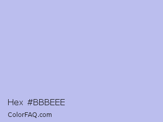Hex #bbbeee Color is a very light blue color and the nearest color is Perano #a9bef2. Hex code #bbbeee and RGB value is rgb(187,190,238). In RGB color space, this color is composed of 73% red, 75% green, 93% blue, In CMYK color space, this color is composed of 21% cyan, 20% magenta, 0% yellow , 7% black , In HSL color space, this color has a hue angle of 236° , 60% saturation and 83% lightness.