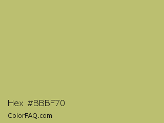 Hex #bbbf70 Color is a normal yellow color and the nearest color is Wild Willow #b9c46a. Hex code #bbbf70 and RGB value is rgb(187,191,112). In RGB color space, this color is composed of 73% red, 75% green, 44% blue, In CMYK color space, this color is composed of 2% cyan, 0% magenta, 41% yellow , 25% black , In HSL color space, this color has a hue angle of 63° , 38% saturation and 59% lightness.
