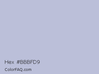 Hex #bbbfd9 Color is a light blue color and the nearest color is Blue Haze #bfbed8. Hex code #bbbfd9 and RGB value is rgb(187,191,217). In RGB color space, this color is composed of 73% red, 75% green, 85% blue, In CMYK color space, this color is composed of 14% cyan, 12% magenta, 0% yellow , 15% black , In HSL color space, this color has a hue angle of 232° , 28% saturation and 79% lightness.