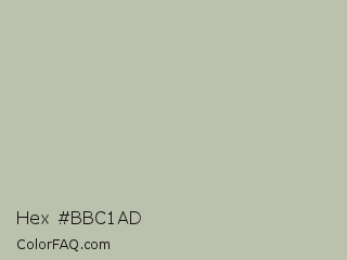 Hex #bbc1ad Color is a light lime color and the nearest color is Green Spring #b8c1b1. Hex code #bbc1ad and RGB value is rgb(187,193,173). In RGB color space, this color is composed of 73% red, 76% green, 68% blue, In CMYK color space, this color is composed of 3% cyan, 0% magenta, 10% yellow , 24% black , In HSL color space, this color has a hue angle of 78° , 14% saturation and 72% lightness.