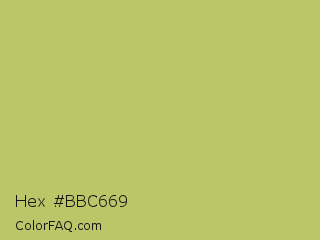 Hex #bbc669 Color is a normal yellow color and the nearest color is Wild Willow #b9c46a. Hex code #bbc669 and RGB value is rgb(187,198,105). In RGB color space, this color is composed of 73% red, 78% green, 41% blue, In CMYK color space, this color is composed of 6% cyan, 0% magenta, 47% yellow , 22% black , In HSL color space, this color has a hue angle of 67° , 45% saturation and 59% lightness.