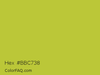 Hex #bbc738 Color is a normal yellow color and the nearest color is Earls Green #c9b93b. Hex code #bbc738 and RGB value is rgb(187,199,56). In RGB color space, this color is composed of 73% red, 78% green, 22% blue, In CMYK color space, this color is composed of 6% cyan, 0% magenta, 72% yellow , 22% black , In HSL color space, this color has a hue angle of 65° , 56% saturation and 50% lightness.