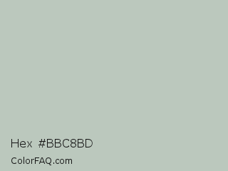 Hex #bbc8bd Color is a light green color and the nearest color is Powder Ash #bcc9c2. Hex code #bbc8bd and RGB value is rgb(187,200,189). In RGB color space, this color is composed of 73% red, 78% green, 74% blue, In CMYK color space, this color is composed of 7% cyan, 0% magenta, 6% yellow , 22% black , In HSL color space, this color has a hue angle of 129° , 11% saturation and 76% lightness.