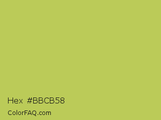Hex #bbcb58 Color is a normal yellow color and the nearest color is Celery #b8c25d. Hex code #bbcb58 and RGB value is rgb(187,203,88). In RGB color space, this color is composed of 73% red, 80% green, 35% blue, In CMYK color space, this color is composed of 8% cyan, 0% magenta, 57% yellow , 20% black , In HSL color space, this color has a hue angle of 68° , 53% saturation and 57% lightness.