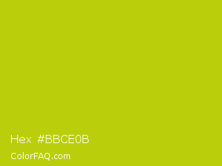 Hex #bbce0b Color is a normal yellow color and the nearest color is Rio Grande #bbd009. Hex code #bbce0b and RGB value is rgb(187,206,11). In RGB color space, this color is composed of 73% red, 81% green, 4% blue, In CMYK color space, this color is composed of 9% cyan, 0% magenta, 95% yellow , 19% black , In HSL color space, this color has a hue angle of 66° , 90% saturation and 43% lightness.