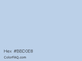 Hex #bbd0e8 Color is a very light blue color and the nearest color is Pale Aqua #bcd4e6. Hex code #bbd0e8 and RGB value is rgb(187,208,232). In RGB color space, this color is composed of 73% red, 82% green, 91% blue, In CMYK color space, this color is composed of 19% cyan, 10% magenta, 0% yellow , 9% black , In HSL color space, this color has a hue angle of 212° , 49% saturation and 82% lightness.