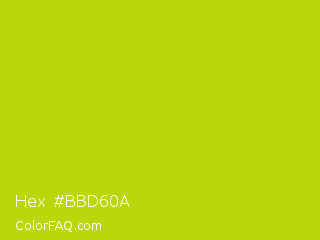 Hex #bbd60a Color is a normal yellow color and the nearest color is Rio Grande #bbd009. Hex code #bbd60a and RGB value is rgb(187,214,10). In RGB color space, this color is composed of 73% red, 84% green, 4% blue, In CMYK color space, this color is composed of 13% cyan, 0% magenta, 95% yellow , 16% black , In HSL color space, this color has a hue angle of 68° , 91% saturation and 44% lightness.