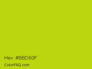 Hex #bbd60f Color is a normal yellow color and the nearest color is Rio Grande #bbd009. Hex code #bbd60f and RGB value is rgb(187,214,15). In RGB color space, this color is composed of 73% red, 84% green, 6% blue, In CMYK color space, this color is composed of 13% cyan, 0% magenta, 93% yellow , 16% black , In HSL color space, this color has a hue angle of 68° , 87% saturation and 45% lightness.