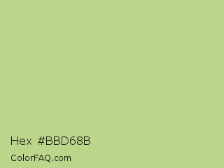 Hex #bbd68b Color is a light green color and the nearest color is Medium Spring Bud #c9dc87. Hex code #bbd68b and RGB value is rgb(187,214,139). In RGB color space, this color is composed of 73% red, 84% green, 55% blue, In CMYK color space, this color is composed of 13% cyan, 0% magenta, 35% yellow , 16% black , In HSL color space, this color has a hue angle of 82° , 48% saturation and 69% lightness.