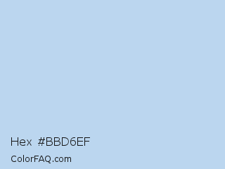Hex #bbd6ef Color is a very light blue color and the nearest color is Spindle #b6d1ea. Hex code #bbd6ef and RGB value is rgb(187,214,239). In RGB color space, this color is composed of 73% red, 84% green, 94% blue, In CMYK color space, this color is composed of 22% cyan, 10% magenta, 0% yellow , 6% black , In HSL color space, this color has a hue angle of 209° , 62% saturation and 84% lightness.