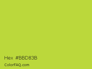 Hex #bbd83b Color is a normal lime color and the nearest color is Conifer #acdd4d. Hex code #bbd83b and RGB value is rgb(187,216,59). In RGB color space, this color is composed of 73% red, 85% green, 23% blue, In CMYK color space, this color is composed of 13% cyan, 0% magenta, 73% yellow , 15% black , In HSL color space, this color has a hue angle of 71° , 67% saturation and 54% lightness.