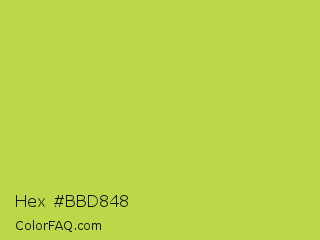 Hex #bbd848 Color is a normal lime color and the nearest color is June Bud #bdda57. Hex code #bbd848 and RGB value is rgb(187,216,72). In RGB color space, this color is composed of 73% red, 85% green, 28% blue, In CMYK color space, this color is composed of 13% cyan, 0% magenta, 67% yellow , 15% black , In HSL color space, this color has a hue angle of 72° , 65% saturation and 56% lightness.