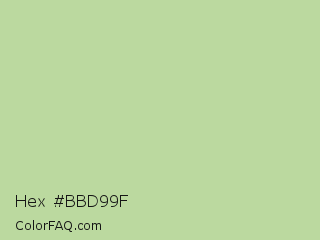 Hex #bbd99f Color is a light green color and the nearest color is Sprout #c1d7b0. Hex code #bbd99f and RGB value is rgb(187,217,159). In RGB color space, this color is composed of 73% red, 85% green, 62% blue, In CMYK color space, this color is composed of 14% cyan, 0% magenta, 27% yellow , 15% black , In HSL color space, this color has a hue angle of 91° , 43% saturation and 74% lightness.