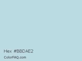 Hex #bbdae2 Color is a very light cyan color and the nearest color is Ziggurat #bfdbe2. Hex code #bbdae2 and RGB value is rgb(187,218,226). In RGB color space, this color is composed of 73% red, 85% green, 89% blue, In CMYK color space, this color is composed of 17% cyan, 4% magenta, 0% yellow , 11% black , In HSL color space, this color has a hue angle of 192° , 40% saturation and 81% lightness.