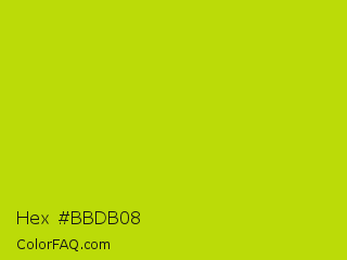 Hex #bbdb08 Color is a normal yellow color and the nearest color is Fuego #bede0d. Hex code #bbdb08 and RGB value is rgb(187,219,8). In RGB color space, this color is composed of 73% red, 86% green, 3% blue, In CMYK color space, this color is composed of 15% cyan, 0% magenta, 96% yellow , 14% black , In HSL color space, this color has a hue angle of 69° , 93% saturation and 45% lightness.