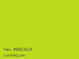 Hex #bbdb1b Color is a normal yellow color and the nearest color is Fuego #bede0d. Hex code #bbdb1b and RGB value is rgb(187,219,27). In RGB color space, this color is composed of 73% red, 86% green, 11% blue, In CMYK color space, this color is composed of 15% cyan, 0% magenta, 88% yellow , 14% black , In HSL color space, this color has a hue angle of 70° , 78% saturation and 48% lightness.