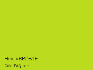 Hex #bbdb1e Color is a normal yellow color and the nearest color is Inch Worm #b0e313. Hex code #bbdb1e and RGB value is rgb(187,219,30). In RGB color space, this color is composed of 73% red, 86% green, 12% blue, In CMYK color space, this color is composed of 15% cyan, 0% magenta, 86% yellow , 14% black , In HSL color space, this color has a hue angle of 70° , 76% saturation and 49% lightness.