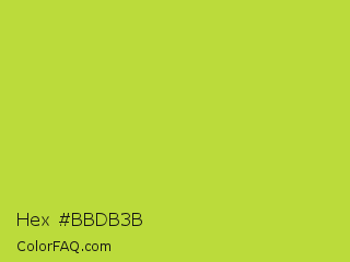 Hex #bbdb3b Color is a normal lime color and the nearest color is Conifer #acdd4d. Hex code #bbdb3b and RGB value is rgb(187,219,59). In RGB color space, this color is composed of 73% red, 86% green, 23% blue, In CMYK color space, this color is composed of 15% cyan, 0% magenta, 73% yellow , 14% black , In HSL color space, this color has a hue angle of 72° , 69% saturation and 55% lightness.