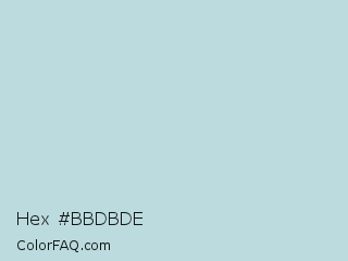 Hex #bbdbde Color is a light cyan color and the nearest color is Ziggurat #bfdbe2. Hex code #bbdbde and RGB value is rgb(187,219,222). In RGB color space, this color is composed of 73% red, 86% green, 87% blue, In CMYK color space, this color is composed of 16% cyan, 1% magenta, 0% yellow , 13% black , In HSL color space, this color has a hue angle of 185° , 35% saturation and 80% lightness.