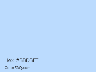 Hex #bbdbfe Color is a very light blue color and the nearest color is Sail #b8e0f9. Hex code #bbdbfe and RGB value is rgb(187,219,254). In RGB color space, this color is composed of 73% red, 86% green, 100% blue, In CMYK color space, this color is composed of 26% cyan, 14% magenta, 0% yellow , 0% black , In HSL color space, this color has a hue angle of 211° , 97% saturation and 86% lightness.
