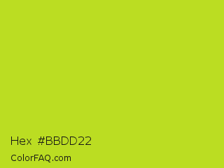 Hex #bbdd22 Color is a normal lime color and the nearest color is Inch Worm #b0e313. Hex code #bbdd22 and RGB value is rgb(187,221,34). In RGB color space, this color is composed of 73% red, 87% green, 13% blue, In CMYK color space, this color is composed of 15% cyan, 0% magenta, 85% yellow , 13% black , In HSL color space, this color has a hue angle of 71° , 73% saturation and 50% lightness.