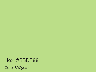 Hex #bbde88 Color is a light green color and the nearest color is Medium Spring Bud #c9dc87. Hex code #bbde88 and RGB value is rgb(187,222,136). In RGB color space, this color is composed of 73% red, 87% green, 53% blue, In CMYK color space, this color is composed of 16% cyan, 0% magenta, 39% yellow , 13% black , In HSL color space, this color has a hue angle of 84° , 57% saturation and 70% lightness.