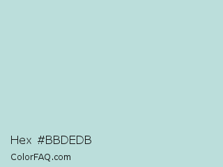 Hex #bbdedb Color is a light cyan color and the nearest color is Ziggurat #bfdbe2. Hex code #bbdedb and RGB value is rgb(187,222,219). In RGB color space, this color is composed of 73% red, 87% green, 86% blue, In CMYK color space, this color is composed of 16% cyan, 0% magenta, 1% yellow , 13% black , In HSL color space, this color has a hue angle of 175° , 35% saturation and 80% lightness.