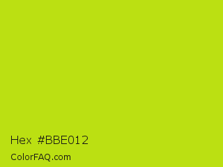Hex #bbe012 Color is a normal lime color and the nearest color is Fuego #bede0d. Hex code #bbe012 and RGB value is rgb(187,224,18). In RGB color space, this color is composed of 73% red, 88% green, 7% blue, In CMYK color space, this color is composed of 17% cyan, 0% magenta, 92% yellow , 12% black , In HSL color space, this color has a hue angle of 71° , 85% saturation and 47% lightness.